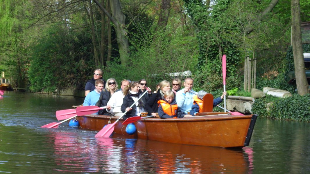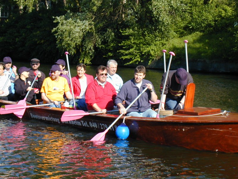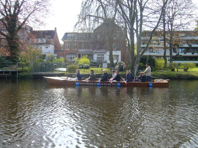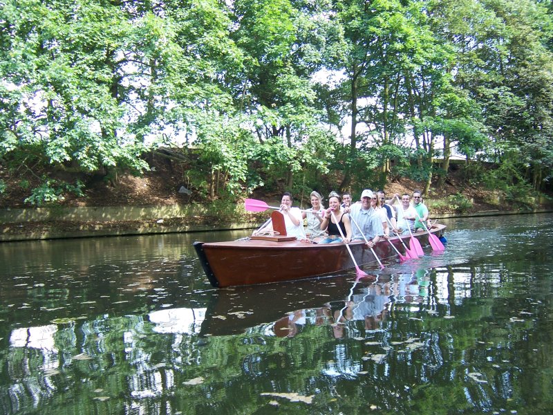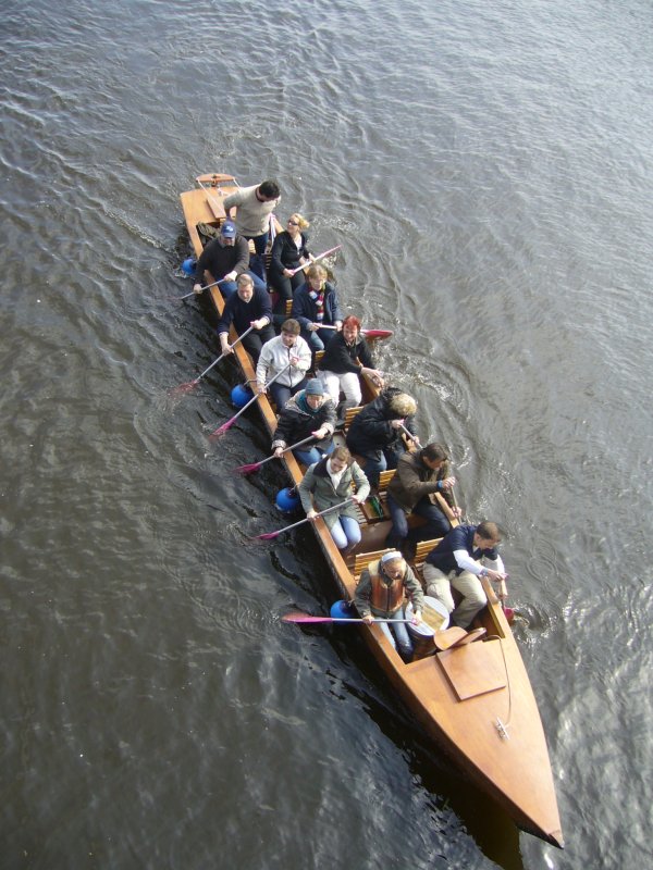 Dieses Mannschaftsboot aus Mahagoni-Holz kann mit bis zu 13 Personen gefahren werden. Auch der Steuermann (ganz hinten) kann sitzen und mit einer auch für Anfänger leicht zu bedienenden Steuerung das Kanu auf Kurs bringen. Dieses lange und schlanke Boot ist von seiner Bauart angelehnt an die bekannten Drachenboote, mit denen Rennen gefahren werden. Unser Drachenkanu ist allerdings so konzipiert, dass auch Ungeübte schnell und sicher darin unterwegs sein können. Das Boot ist nahezu kentersicher und garantiert viel Spass bei sportlicher Betätigung. Dieses Kanu ist das geeignete Boot für einen Betriebsausflug oder eine Geburtstagsfeier mit Tour auf der Alster und den Hamburger Kanälen. Bei Bedarf können Schwimmwesten oder wasserdichte Stautonnen zusätzlich günstig gemietet werden.