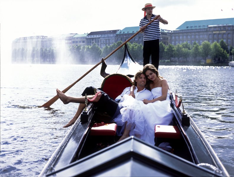 Wir bietet Ihnen etwas ganz besonderes: mit einer venezianischen Gondel über die Alster und Hamburgs Kanäle fahren! Das 10,98 Meter lange, 1,42 Meter breite und 500 Kilo schwere, außergewöhnliche Boot wird von einem Gondoliere oder einer Gondoliera voranbewegt. Dieser steht hinten auf dem Heck und führt die lange Ruderstange, genannt Remo, mit gleichmäßig wiederkehrenden, ruhigen Bewegungen der Arme, so dass die Gondel in stiller Eleganz dahingleitet.