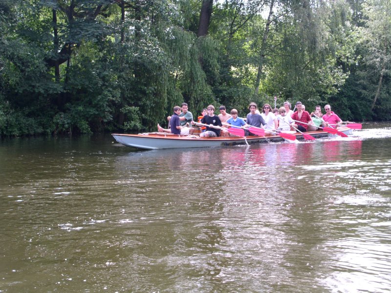 Der Barmbeker Wasserbüffel ist das Mannschaftsboot für bis zu 17 Personen. 16 Personen paddeln seitlich mit dem Stechpaddel, eine Person bedient das einfach zu handhabende Leinenruder. Stauräume für Proviant sind ausreichend vorhanden.